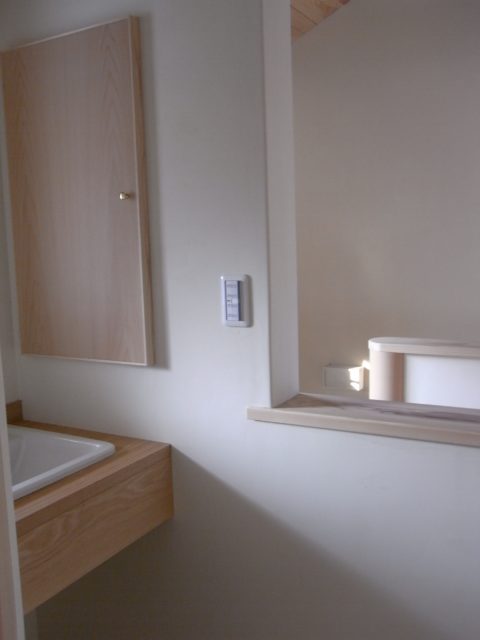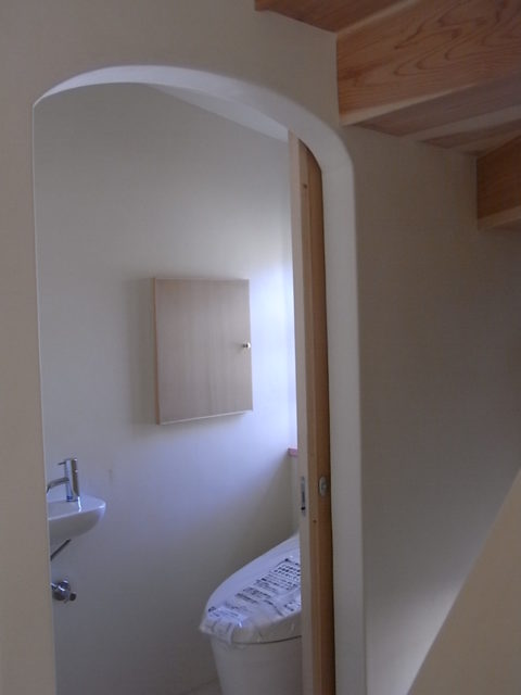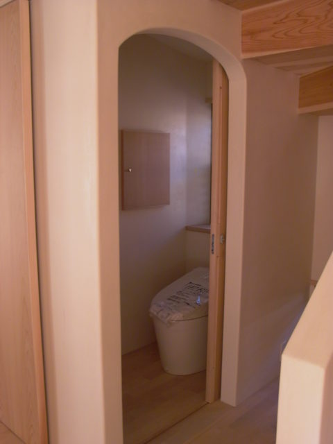 北本の杜のトイレ。一階は階段下を利用して、入口はやさしい雰囲気になるようにRの入口にしました。小物入れと手洗いも設けています。2階のトイレは、洗面コーナーの隣に。nidoさんのスタンドガラスを灯りとりにしました